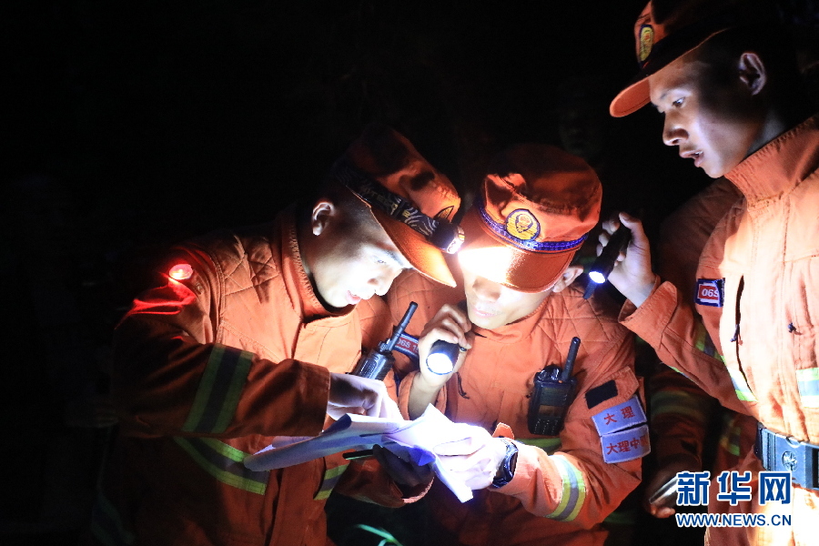 大理中队森林消防员开展夜间林内找点训练(摄于8月8日)。新华网发(满东飞 摄)