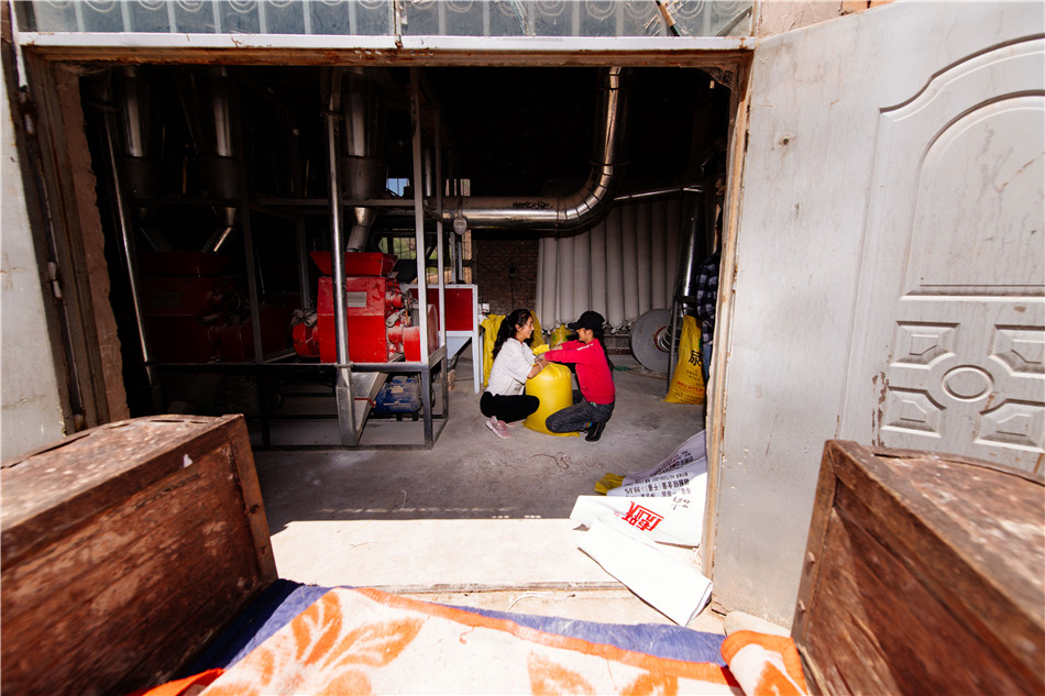 在青海省化隆回族自治县金源藏族乡科上村,索南措毛(右)和桑毛帮助亲戚把磨好的青稞装袋(8月1日摄)。新华社记者 吴刚 摄