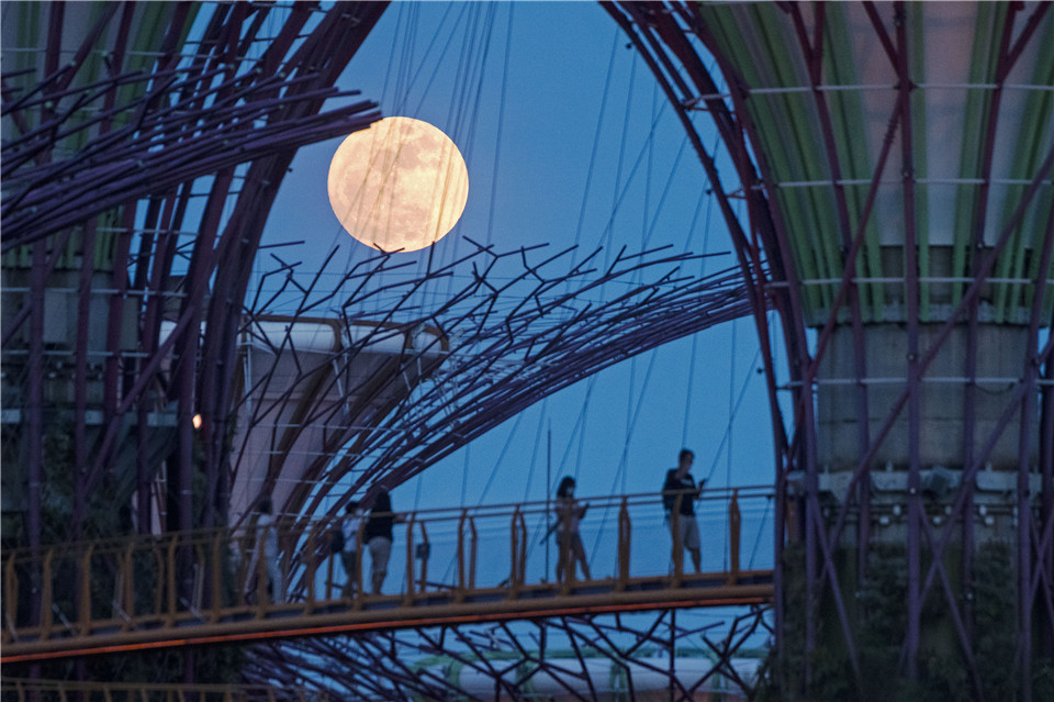 10月1日,圆月在新加坡滨海湾花园上空升起。 新华社发(邓智炜摄)
