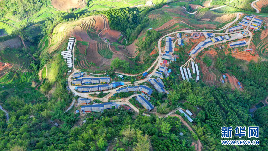 中国华能集团有限公司对口帮扶普洱市和临沧市的拉祜族、佤族两个“直过民族”,2016年至2019年,累计投入20亿元,实施了基础设施、教育、产业等扶贫项目。图为华能集团实施的“直过民族”示范村建设项目——普洱市澜沧县马鞍山村民小组新貌,无人机视角下,犹如一匹奔腾的骏马(2020年6月13日摄)。(新华网 赵普凡 摄)