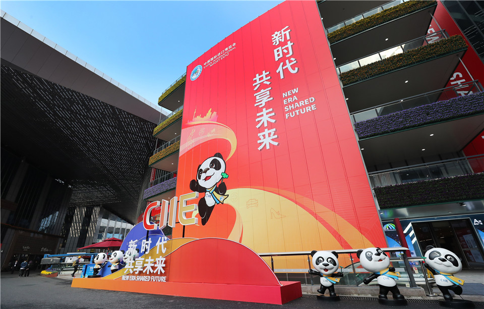 国家会展中心(上海)内布置的熊猫“进宝”主题装饰(11月2日摄)。 连日来,第三届中国国际进口博览会举办地国家会展中心(上海)内一派忙碌景象,各个展馆的搭建和布置工作正有条不紊地进行。第三届中国国际进口博览会暨虹桥国际经济论坛开幕式将于11月4日在上海举行。