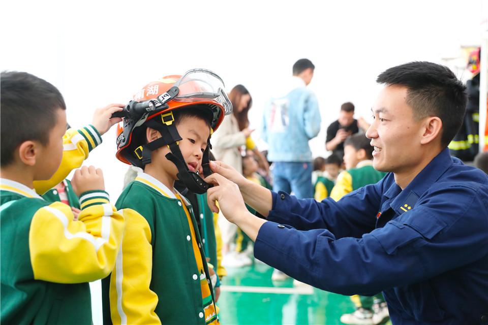 11月5日,在湖南省永州市新田县消防救援大队,幼儿园的孩子在消防救援人员指导下试穿消防防护装备。 近日,各地学校纷纷开展以消防安全教育为主题的活动,迎接“全国消防日”的到来。 新华社发(刘贵雄 摄)