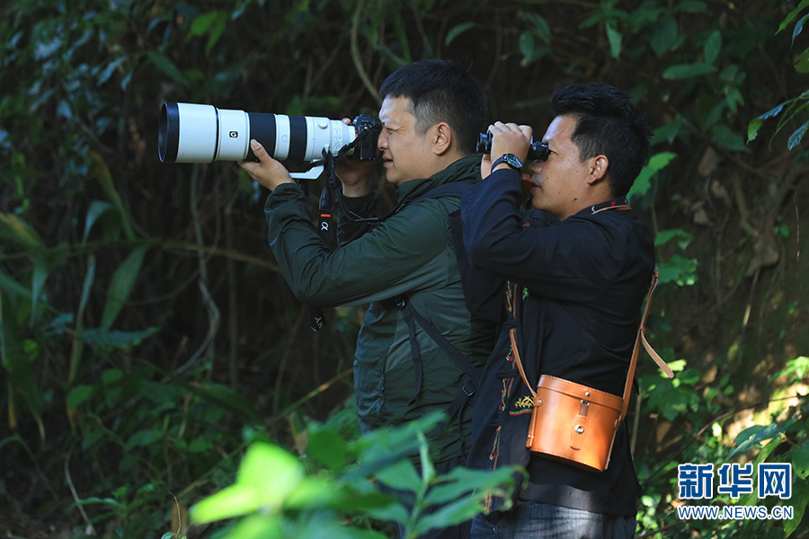 自2015年盈江县石梯村发展观鸟产业后,由于工作需要,尹以祜开始了自然生态题材类的新闻报道,并常年前往石梯村进行采访拍摄。图为尹以祜(左一)在当地村民的带领下进山拍摄(10月27日摄)。新华网 范芳钰/文 赵普凡/图