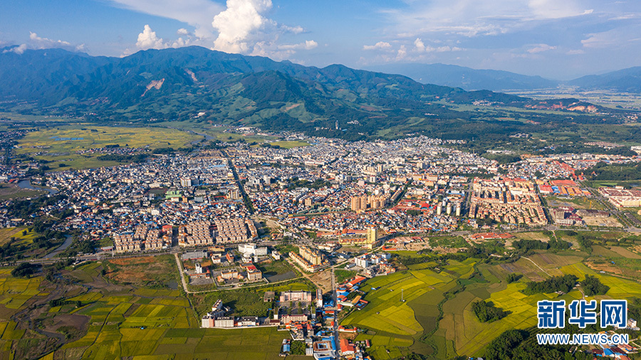 尹以祜用镜头展现了一个民族村落的发展变化,见证了全村上下积极参与打赢脱贫攻坚战的不懈努力,也感受到了盈江县对于生态保护的决心和信心。图为航拍镜头下的盈江县城(9月3日摄)。新华网发(尹以祜 摄)