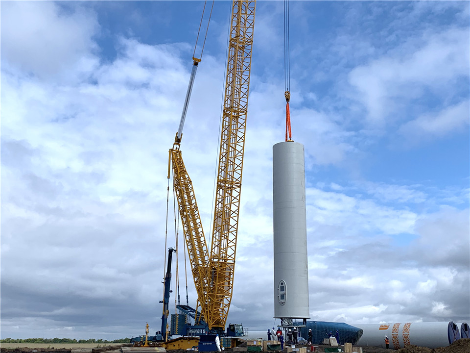 在哈萨克斯坦科斯塔奈州风电场施工现场,工作人员吊装中国生产的风机叶片(8月28日摄)。 新冠疫情期间,中国和哈萨克斯坦克服困难,继续推动新能源领域合作。中国生产的风电设备跨越数千公里运输至哈萨克斯坦,助力哈萨克斯坦可再生能源项目。