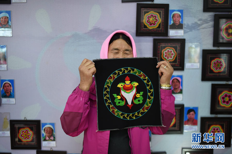 11月6日,绣娘张卓玛什在班彦新村土族盘绣扶贫车间内展示作品。新华社记者 戴天放 摄