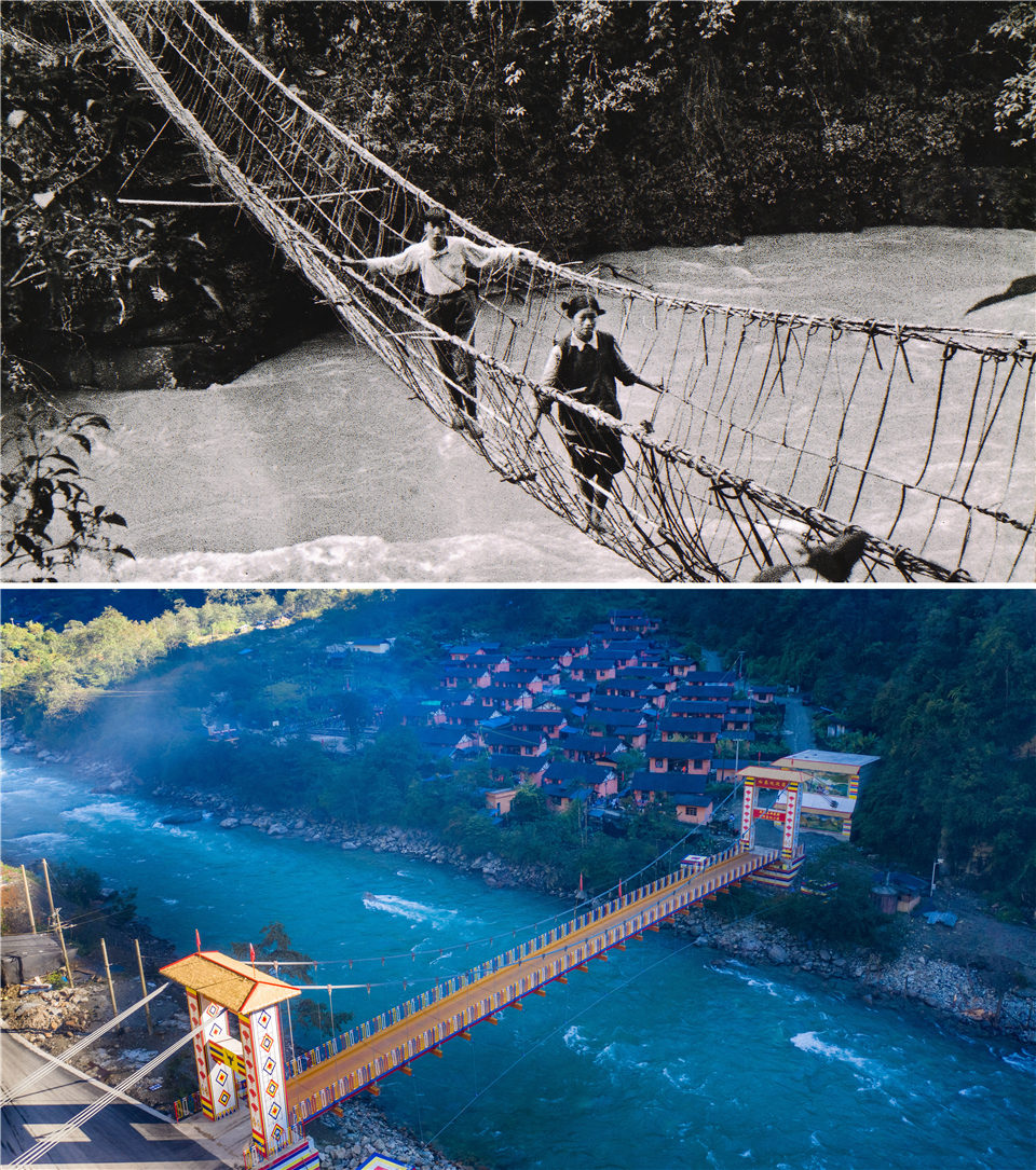 拼版照片上图:独龙族群众通过藤蔑桥(资料照片);下图:独龙江乡白来感恩大桥(10月29日摄,无人机照片,新华社记者胡超摄)新华社发