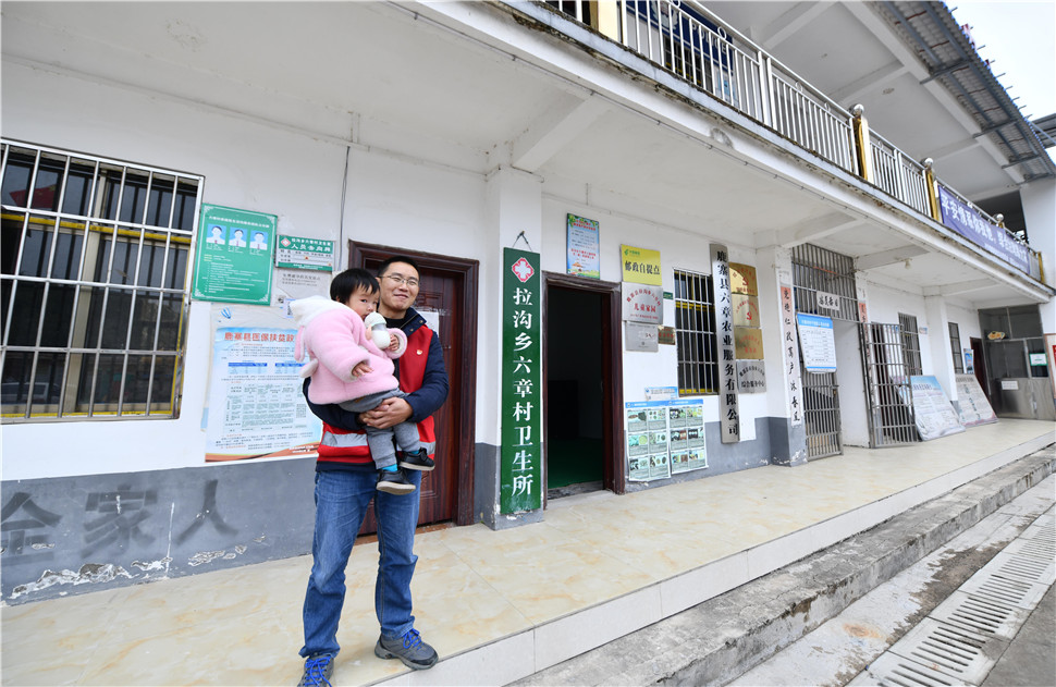 12月18日,在广西鹿寨县拉沟乡六章村,朱彪抱着女儿朱家仪站在办公楼前。新华社记者 黄孝邦 摄