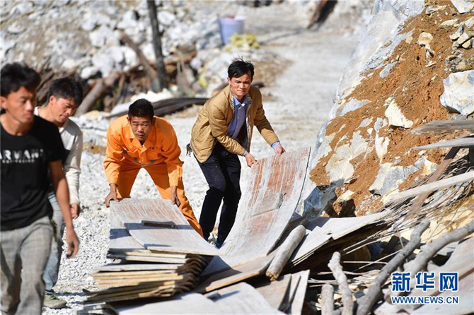八好村驻村第一书记韦德王(右一)和群众一起搬运木板,准备修建水柜(2019年12月16日摄)。新华社记者黄孝邦摄