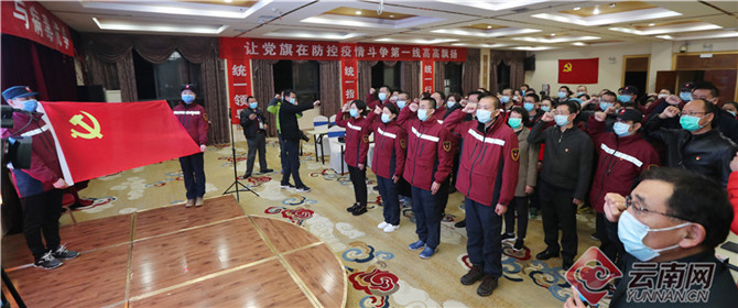 宣誓仪式简单朴素,在前方总指挥部,云南医疗队祝文银、郤俊芳、赵健华、李勰高举右手,面向党旗许下庄严的誓言,他们在防控新冠肺炎疫情一线,通过特别的方式加入了中国共产党。同时,医疗队临时党委分散咸安区、通城、赤壁、嘉鱼、崇阳的另外六名预备党员张吉东、李玲、王雪玉、张丽池、杨芳发、黄秋林也通过手机连线的方式,宣誓一线加入中国共产党。
