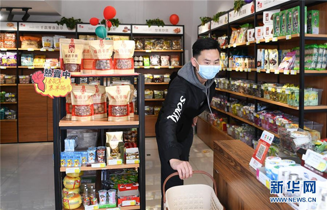3月20日,湖北宜昌西陵区一家零食店的店主在做开门营业的准备工作。 新华社记者 程敏 摄