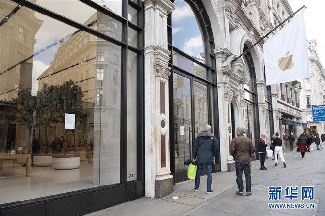 3月16日,在英国伦敦,人们阅读一家苹果零售店门口贴出的暂停营业告示。新华社发(雷伊·唐摄)