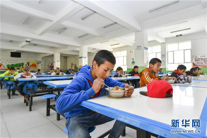 新疆塔什库尔干塔吉克自治县城乡寄宿制小学学生在吃营养午餐(6月3日摄)。 新华社记者 胡虎虎 摄