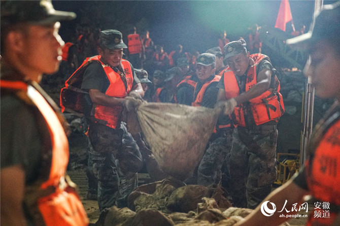 人民网颍上7月28日电 记者刚刚从前线获悉,经过3000多名作战部队官兵、地方民兵、武警官兵等和上千名地方干部群众两天两夜紧急奋战,目前,安徽省颍上姜唐湖蓄洪区戴家湖险情已基本得到控制。涌水流量已从最大时的每秒30多个流量,降到目前每秒两个流量(水文部门监测)堵水已完成90%以上。