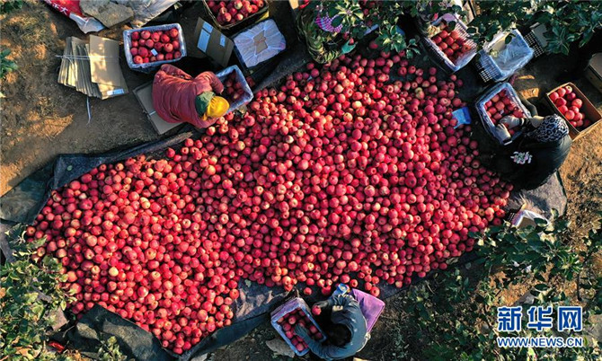 辽宁省锦州市义县张家堡镇土营子村果农在果园里将采摘的苹果装箱(11月4日摄,无人机照片)。新华社记者 姚剑锋 摄