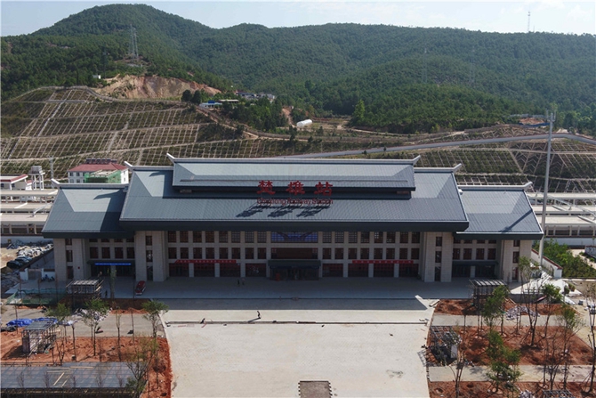楚雄站,原名楚雄北站,为楚雄市高铁站,于2018年7月1日随着昆楚铁路开通正式投入使用。楚雄站的开通也标志着楚雄正式跨入高铁时代,与昆明、大理形成一小时交通生活圈。楚雄站位于楚雄市东瓜镇车坪社区,占地约1万平方米,为“三站台七线”,能同时容纳5000人聚集乘车。站房建筑风格浓缩了楚雄彝族地方特色,屋面覆盖着清灰瓦,站房色调以红色为主色。