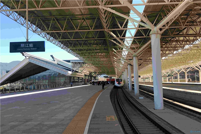 丽江站站房面积11821平方米,建筑高度32.50米,长182米,宽50.3米,两个候车室共设1200个座椅,乘客可由一楼候车室进站通道进入二、三站台,或由二楼候车室天桥直接进入一站台。