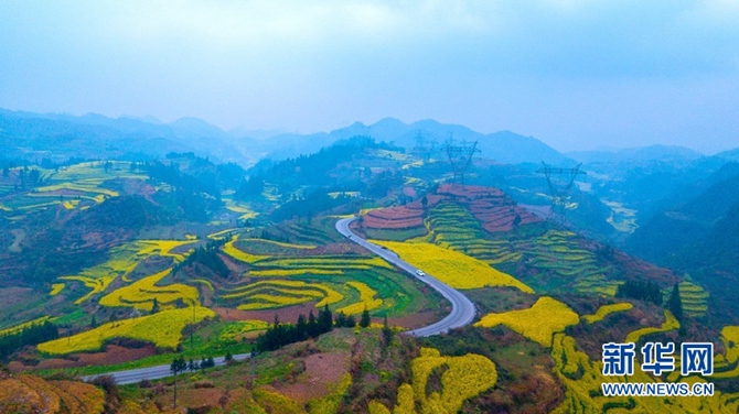 阳春三月,春回大地,云南省富源县油菜花竞相开放。无人机视角下,漫山遍野菜花蜜香、满目金黄,犹如大自然的调色板,春色春景美如画卷,令人流连忘返。
