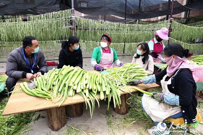 大理州洱源县300多亩贡菜鲜菜销售受阻,贡菜菜农把鲜贡菜加工成干条,再对外销售。摄影:年耀红