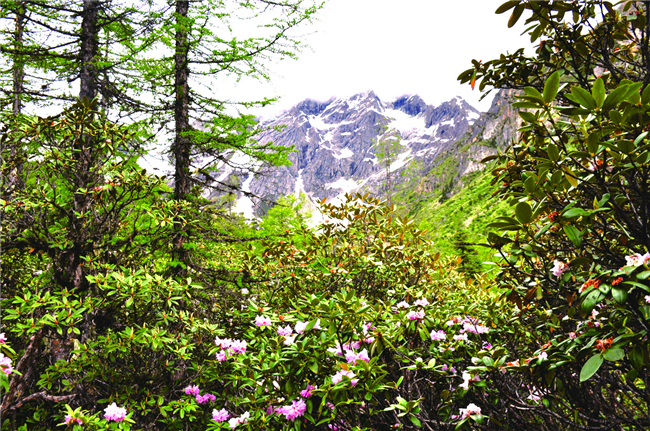 在牧场简单吃过午饭,我们迎来了一段上坡路,一路上,伴随我们的是大片的杜鹃花海。最终,在4100米海拔处看见了此次徒步的终点——座落在雪山脚下的第一牧场。随着海拔升高,气温下降,在雨雪朦胧中,牧民正赶着牛羊过河,所有人静静伫立,感受着大自然的纯粹与神奇。