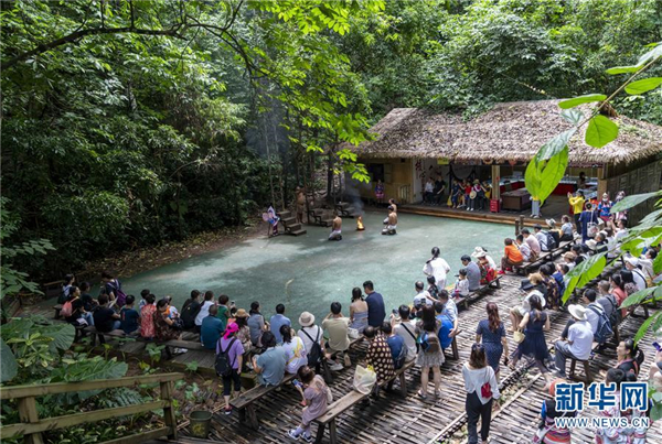 8月13日,游客在基诺山寨内观看实景演出。 近年来,云南省西双版纳傣族自治州景洪市基诺山基诺族乡坚持保护传承基诺族文化,助推“文化旅游扶贫”和“文旅融合”发展。当地以该乡巴亚村委会巴坡村小组为基础打造知名旅游景区基诺山寨,集中展示基诺族特色文化,拓宽基诺族相关文化产品的销售渠道,助力村民就业增收。 新华社记者 陈欣波 摄