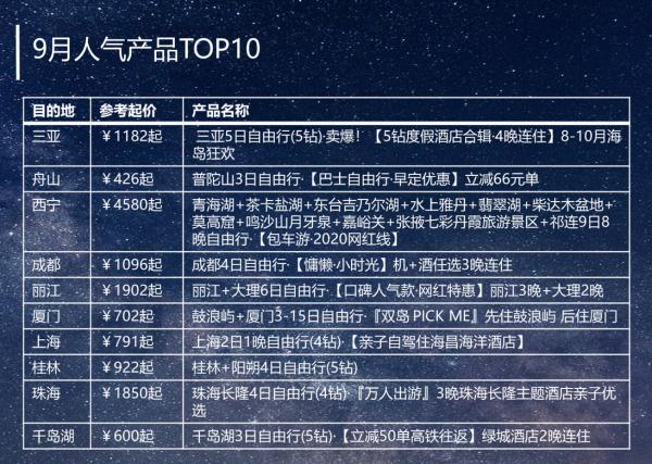从预订情况看,9月国内游十大最具人气线路包括三亚、西宁、成都、丽江、舟山、厦门、上海、桂林、珠海、千岛湖。比如,三亚5日自由行(5钻)双飞4晚连住1182元起、普陀山3日自由行往返巴士+酒店任选426元起、青海甘肃9日8晚自由行包车游2020网红线4580元起、成都4日自由行机+酒任选3晚连住1096元起、丽江+大理6日自由行热门商圈古城特色客栈1902元起等。海南、四川、云南等地成为抄底游热门。