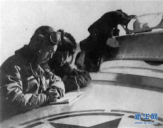 志愿军航空兵某团两名飞行员一同研究装备(资料照片)。 新华社发