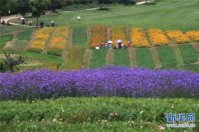 市民在云南曲靖市麒麟区麒麟爱情小镇赏花(6月5日摄)。 近年来,云南省曲靖市持续开展城乡脏乱治理,提升市民文明素质,城乡人居环境得到很大改善:大街小巷整洁有序,公园广场干净靓丽,处处碧水绕城、绿荫满城,使老百姓享受到美丽的生活环境带来的幸福感。 新华社记者 杨宗友 摄