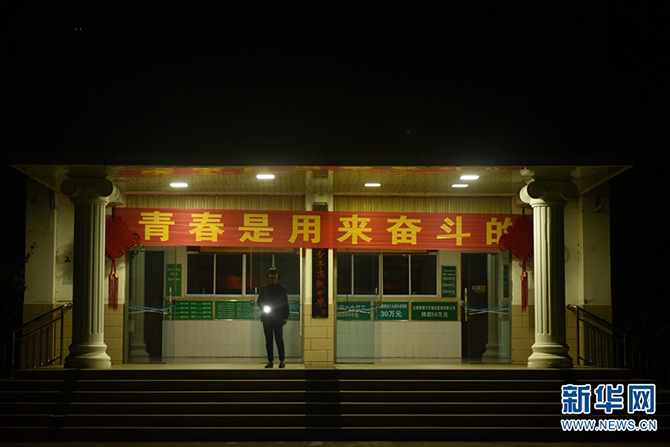 5点20分左右,张桂梅来到教学楼前,开门、亮灯。(新华网 李宁 摄)