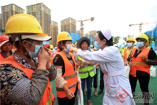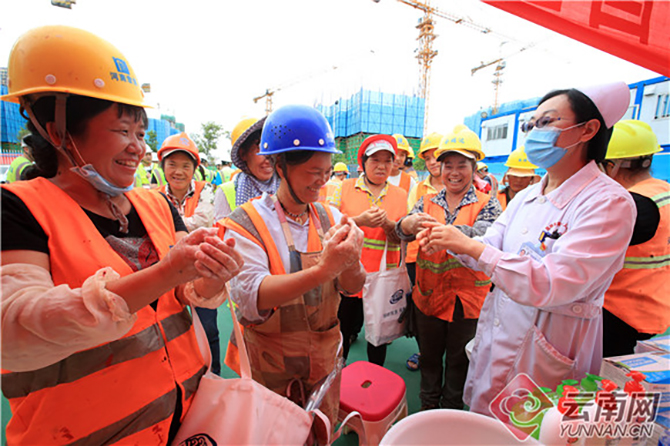 活动紧扣爱国卫生运动主题,现场为100余名农民工开展了免费健康体检,发放了急救包和健康卫生知识宣传材料,昆明市第一人民医院的医生现场教学,指导农民工如何正确洗手、正确佩戴口罩。“以前洗手就随便搓搓,原来洗不干净啊,今天真是涨知识了。”在医生的指导下,工人们把洗手液涂在手上,洗手掌、洗背侧指缝、洗掌侧指缝、洗指背、洗拇指、洗指尖、洗手腕,依次按照步骤认真地洗了起来。“从事建筑行业的农民工接触的环境复杂,身体健康状况需要引起高度重视,更需要学会正确的洗手方法和佩戴口罩方法。”共青团昆明市委相关负责人表示,今后将开展一系列关心关爱农民工活动,把爱国卫生运动内容融入其中,教育引导农民工群体勤洗手、讲卫生、重健康。