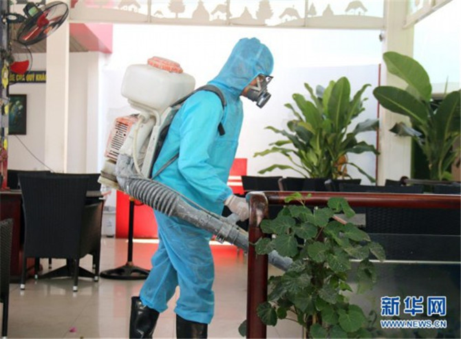 3月12日,在越南中部平顺省,工作人员开展消毒工作。新华社/越通社