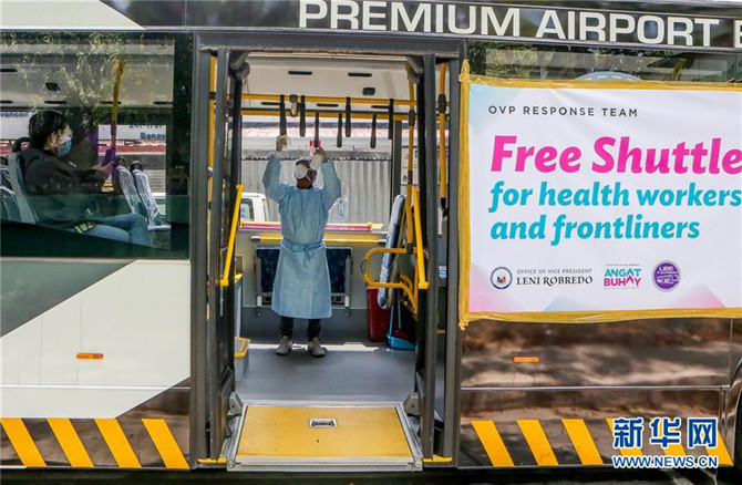 3月18日,在菲律宾大马尼拉地区奎松市,工作人员在免费供医护人员和抗疫一线工作者搭乘的公共汽车上消毒。新华社发(乌马利摄)