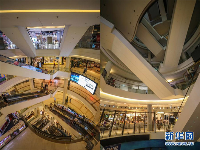 这是3月21日拍摄的泰国曼谷暹罗百丽宫商场(左图)和3月22日拍摄的停止营业的商场的对比图。 新华社记者 张可任 摄