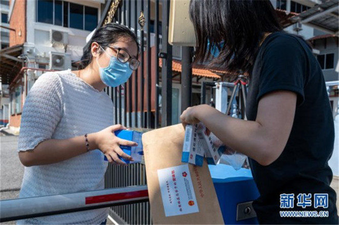 4月8日,在马来西亚吉隆坡市郊的马来亚大学国际学生宿舍,中国留学生志愿者强晶晶(右)分发中国驻马大使馆为中国留学生准备的“健康包”。新华社记者 朱炜 摄