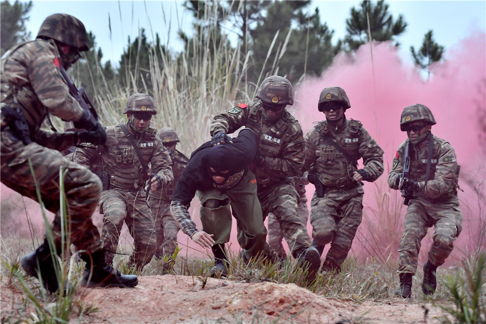 1月5日,武警福建总队特战队员在山林地捕歼战斗训练中抓捕“暴恐分子”。新华社发(李涛 摄)