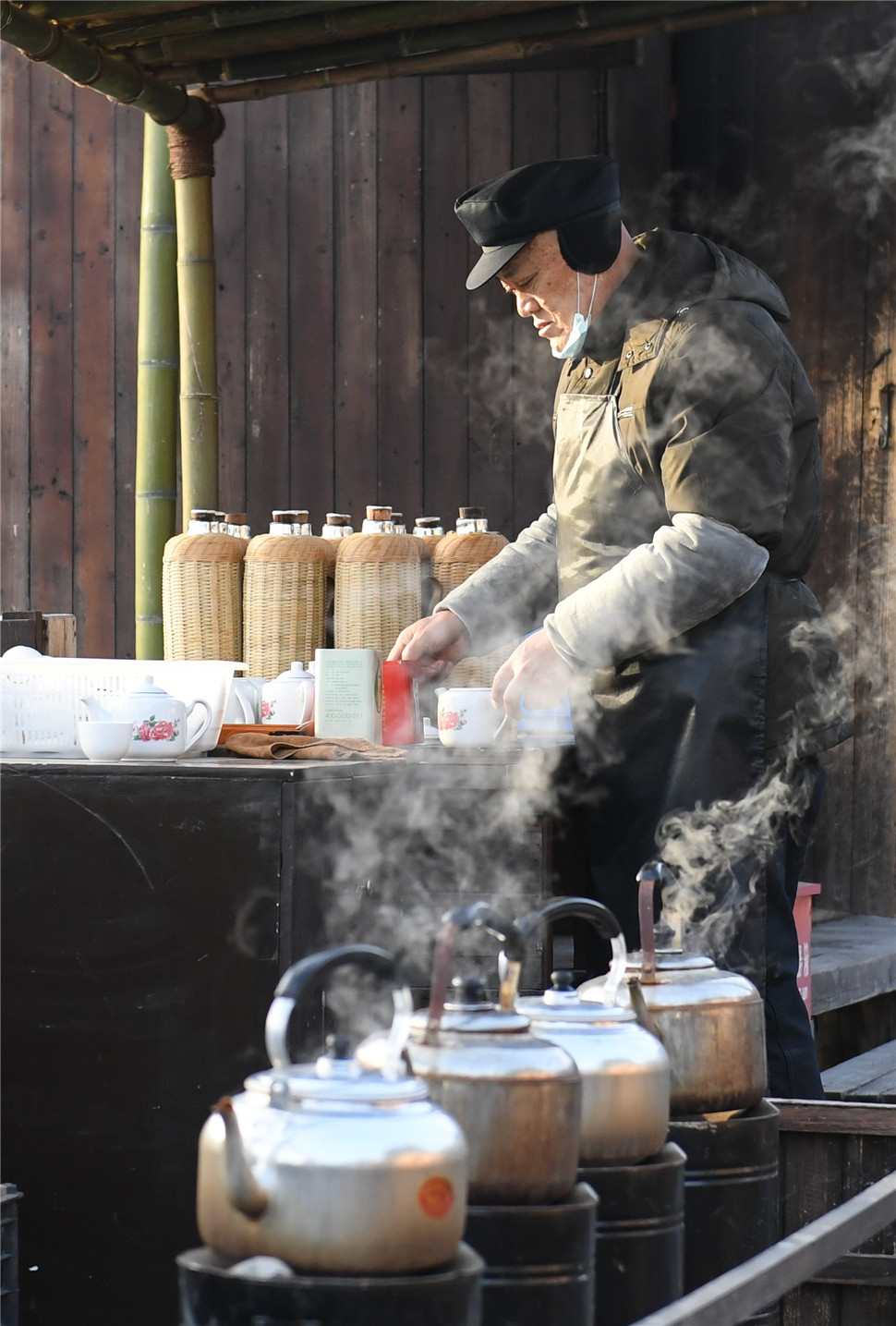1月12日,一名摊主在乌镇一边煮茶一边给客人制作早餐。新华社记者 翁忻旸 摄