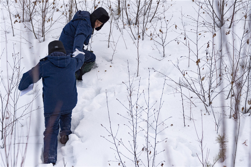 1月12日,吕建生(上)和王少亭在北极村附近的山林中进行电力巡线。新华社记者 谢剑飞 摄