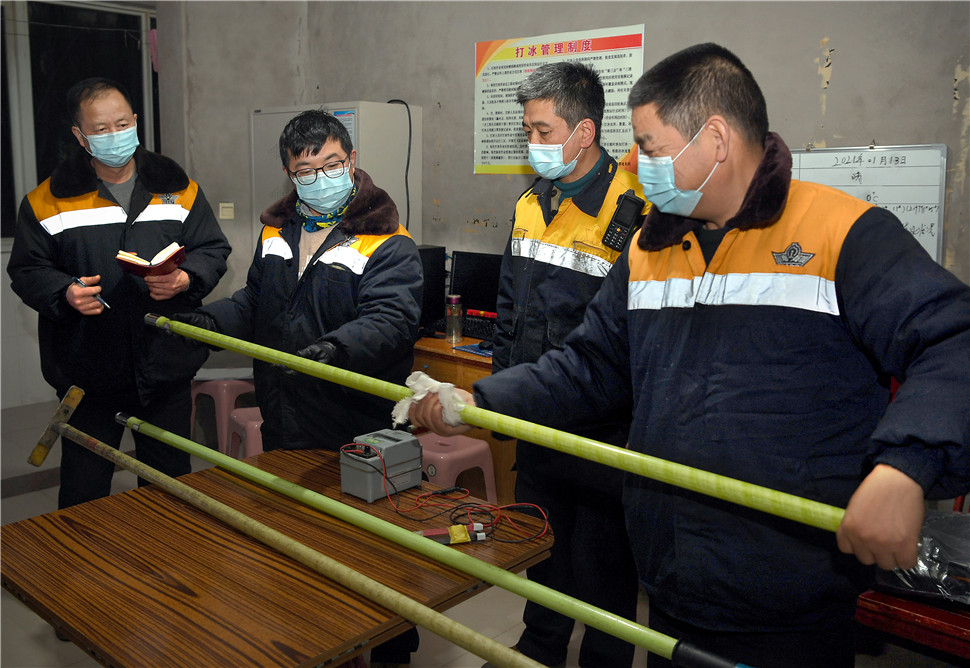 郭振中(左)在驻地和工友们一起做打冰作业前的准备工作(1月12日摄)。