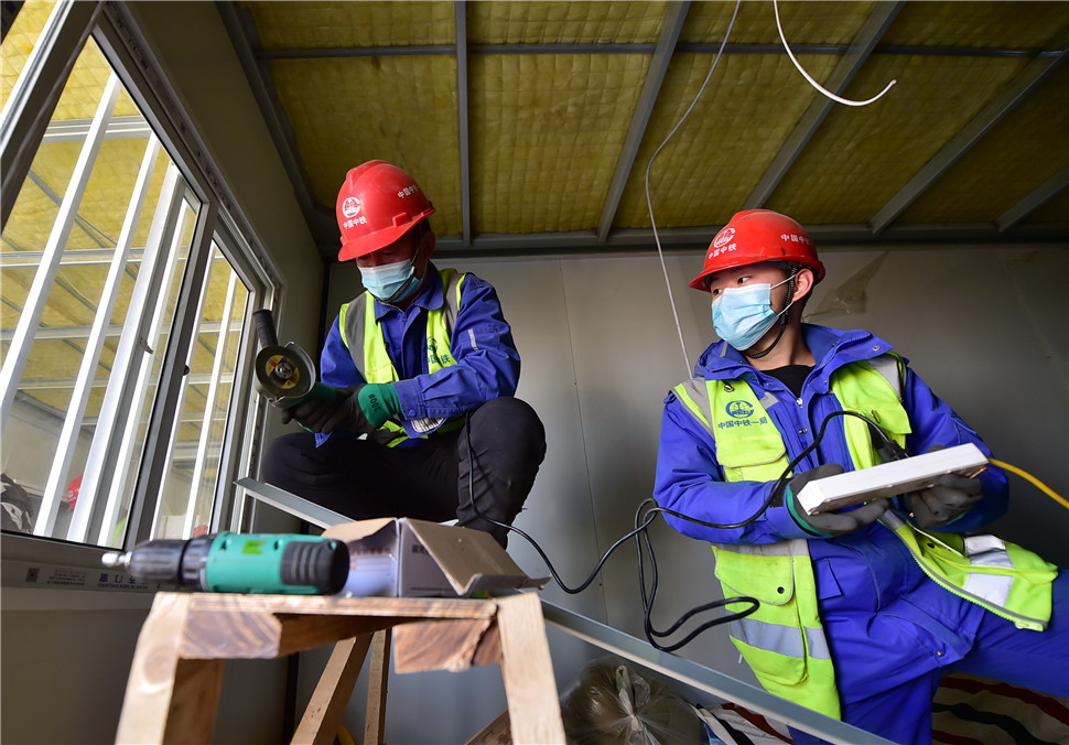1月21日,罗长安(左)、罗言东父子在石家庄黄庄公寓隔离场所建设工地工作。
