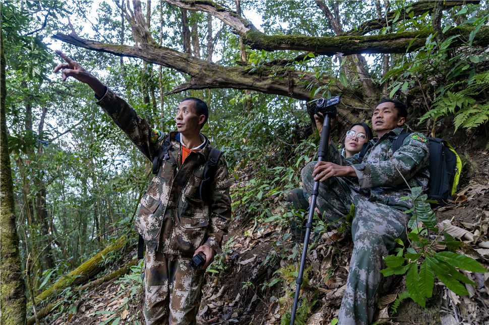 熊世明(左)在指示长臂猿出现的位置(1月22日摄)。