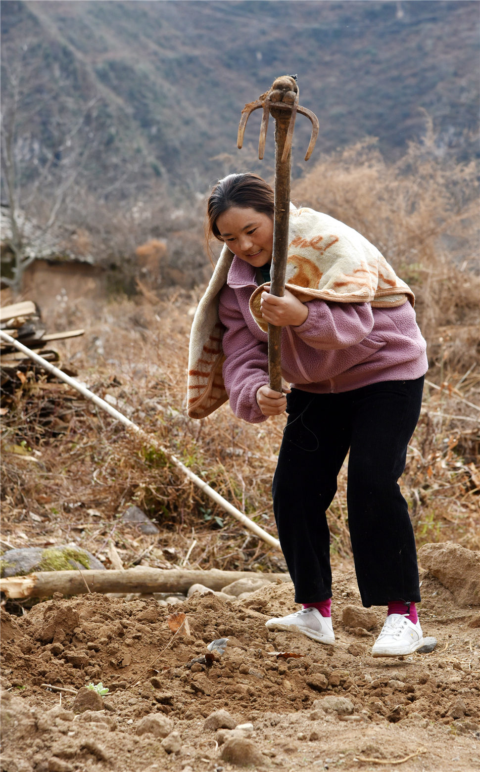 2月16日,巴木玉布木在平整家门口的泥土。新华社记者 周科 摄