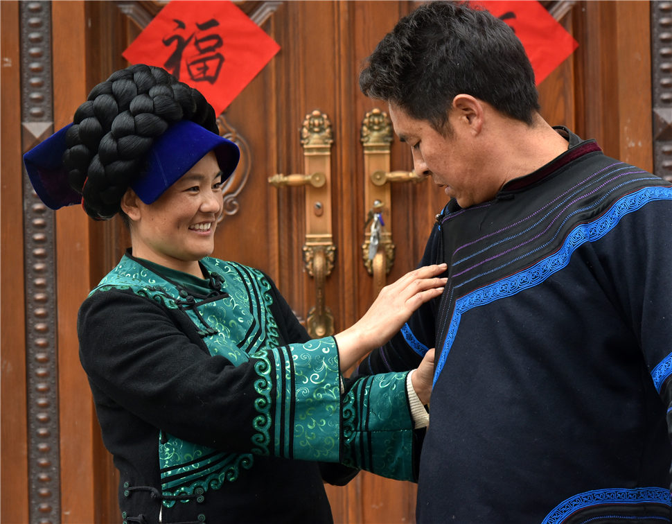 2月17日,巴木玉布木在给丈夫巫其石且整理着装。新华社记者 周科 摄
