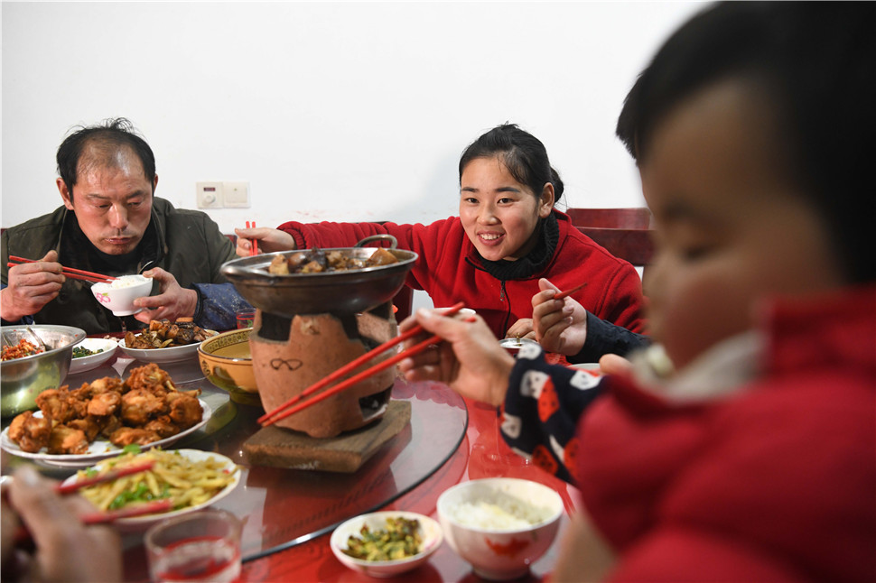 元宵佳节,张志菊(中)和家人一起吃晚饭(2月26日摄)。