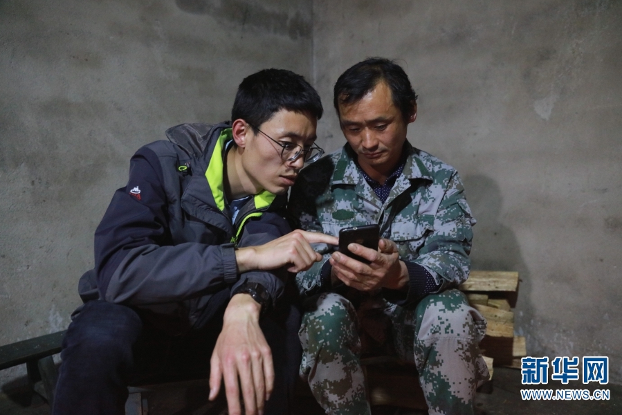 牛晓炜(左)与监测员观看西黑冠长臂猿图片(3月3日摄)。新华网 赵普凡 摄