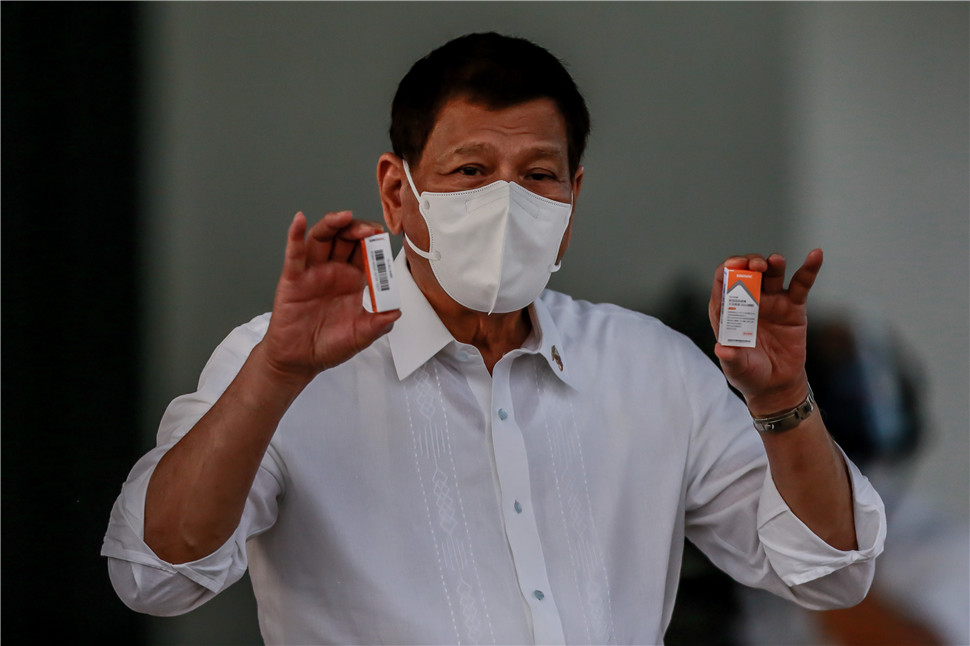 3月29日,菲律宾总统杜特尔特在马尼拉展示运抵的中国科兴新冠疫苗。