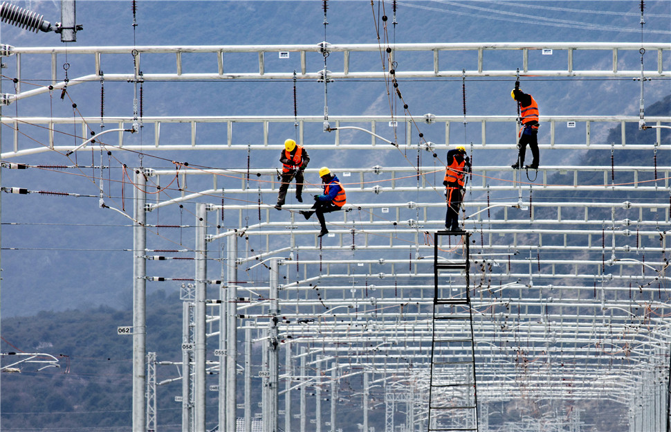 3月29日,中铁电气化局集团技术工人在拉林铁路进行接触网精调作业。
