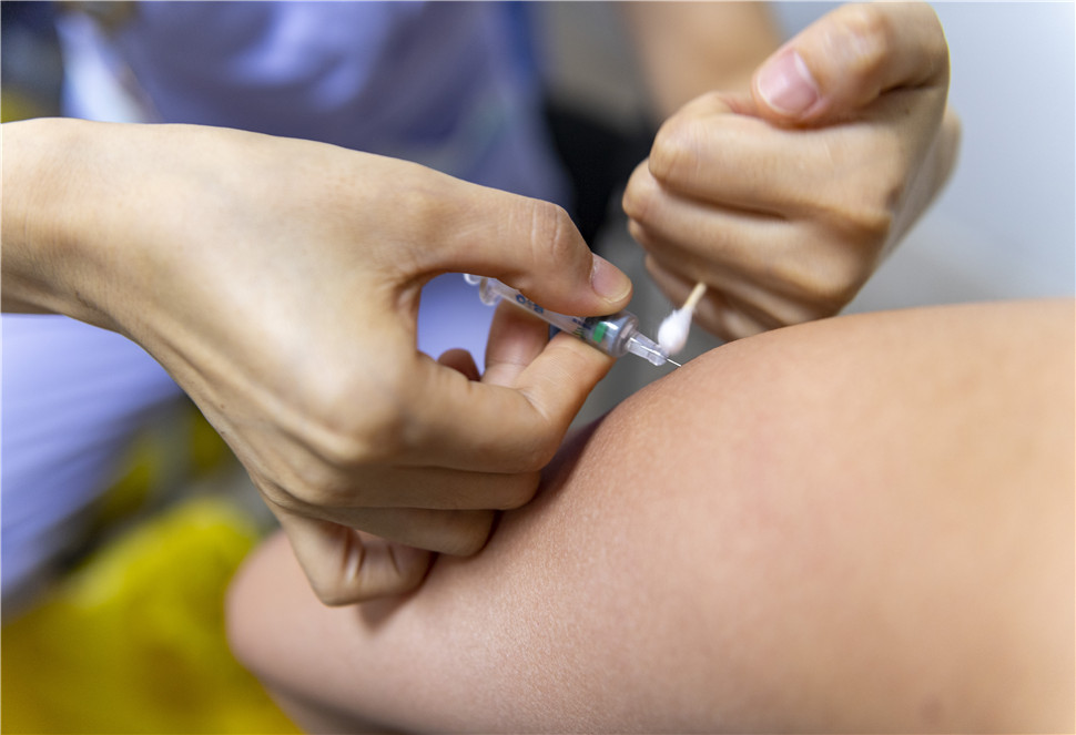 4月1日,在瑞丽市景成医院新冠疫苗接种点,医护人员给市民接种疫苗。