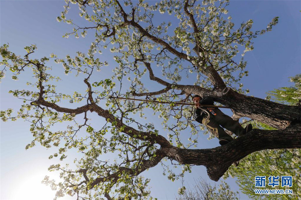 4月6日,河北唐山遵化市铁厂镇东平台村的农民在果园管护梨树。