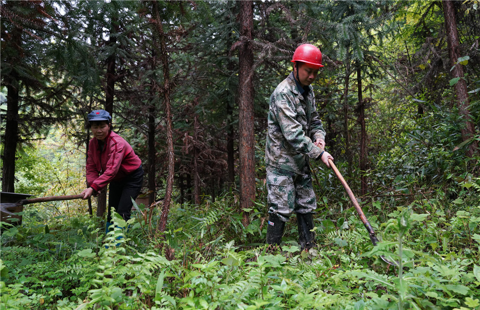 4月16日,蓝先华和妻子在山林中抚育树木。新华社记者 胡晨欢 摄