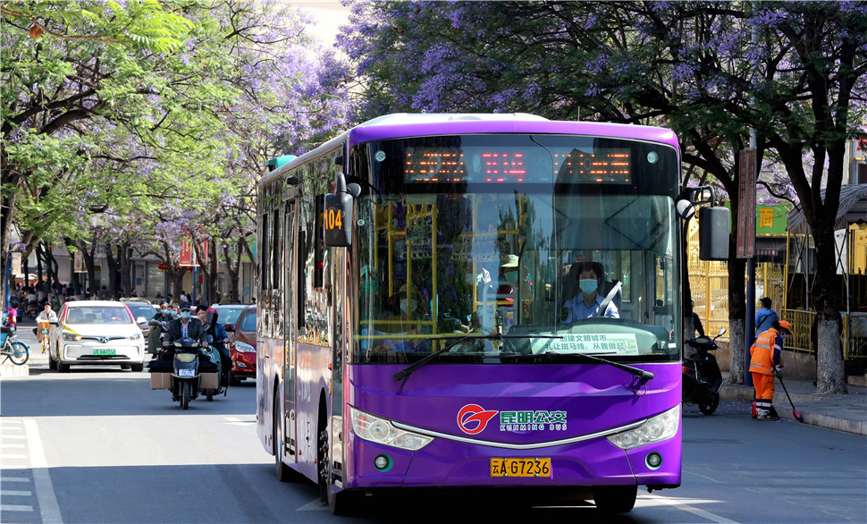 据了解,从19日正式开行的104路蓝花楹主题公交由公交六公司24车队推出,目前每天开行两辆,与普通车辆混合发车,途径教场中路在蓝花楹主题公园及沿线设立站点4个,不仅为方便市民和外地游客更好地观赏和体验春城的美景提供便利,也通过蓝花楹主题公交的开行积极倡导绿色出行的低碳环保理念。